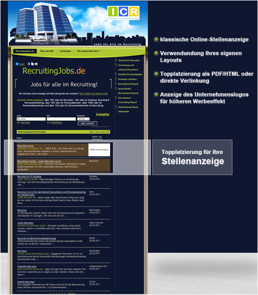 Topplatzierung angezeigt. Topplatzierung Ihrer Stellenanzeige bedeutet, daß bei passender Suchanfrage Ihre Anzeigen immer oben in der Ergebnisliste auf einer der ersten beiden Positionen erscheinen. Um eine optimale Reichweite zu erlangen, wird Ihre Anzeige auf RecruitingJobs.de und bei unserem Kooperationspartner kimeta veröffentlicht.